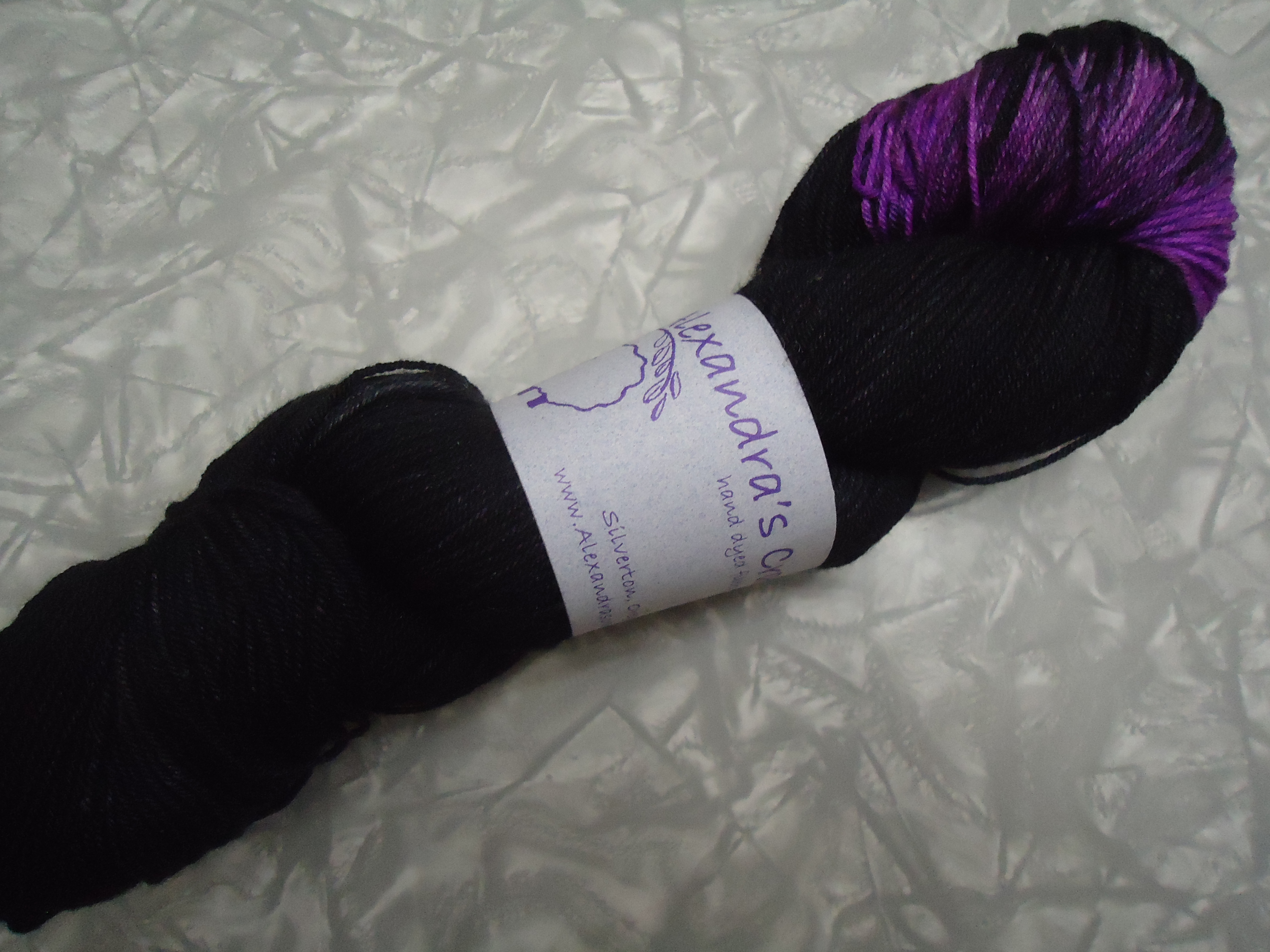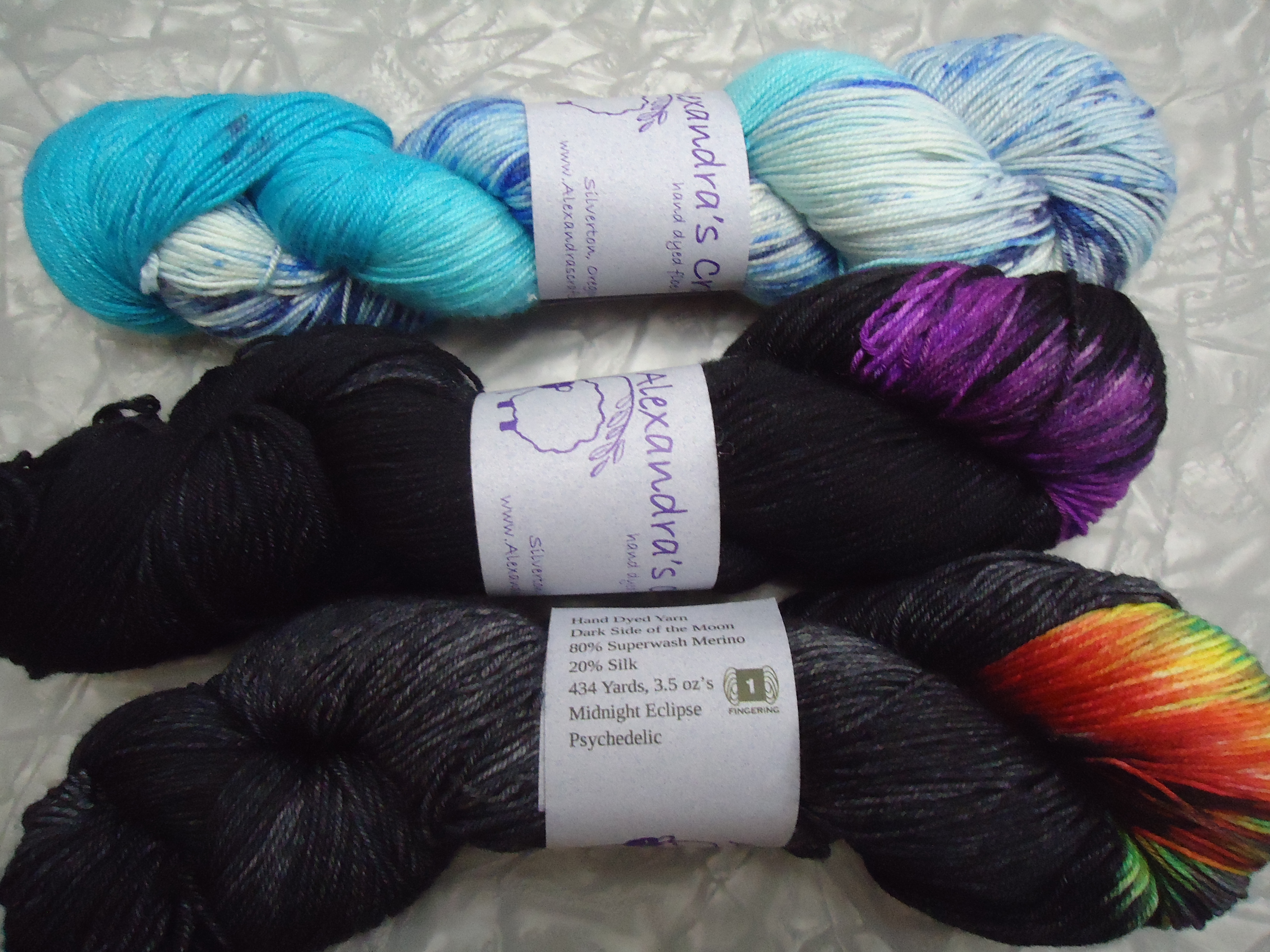 But today, we had Alexandra’s Crafts visiting at Far North Yarn Company! The dyer (I’m guessing Alexandra, but not sure about that) does a lot of nifty yarns – gradients, speckles and tonals. But her special thing she does is just a blip of color on one end of a skein, while the rest is a neutral – black, gray, or white mostly. It looks nifty as all get out! She does some of these with just one or two colors, but her special specialty is rainbows! So guess what I got?