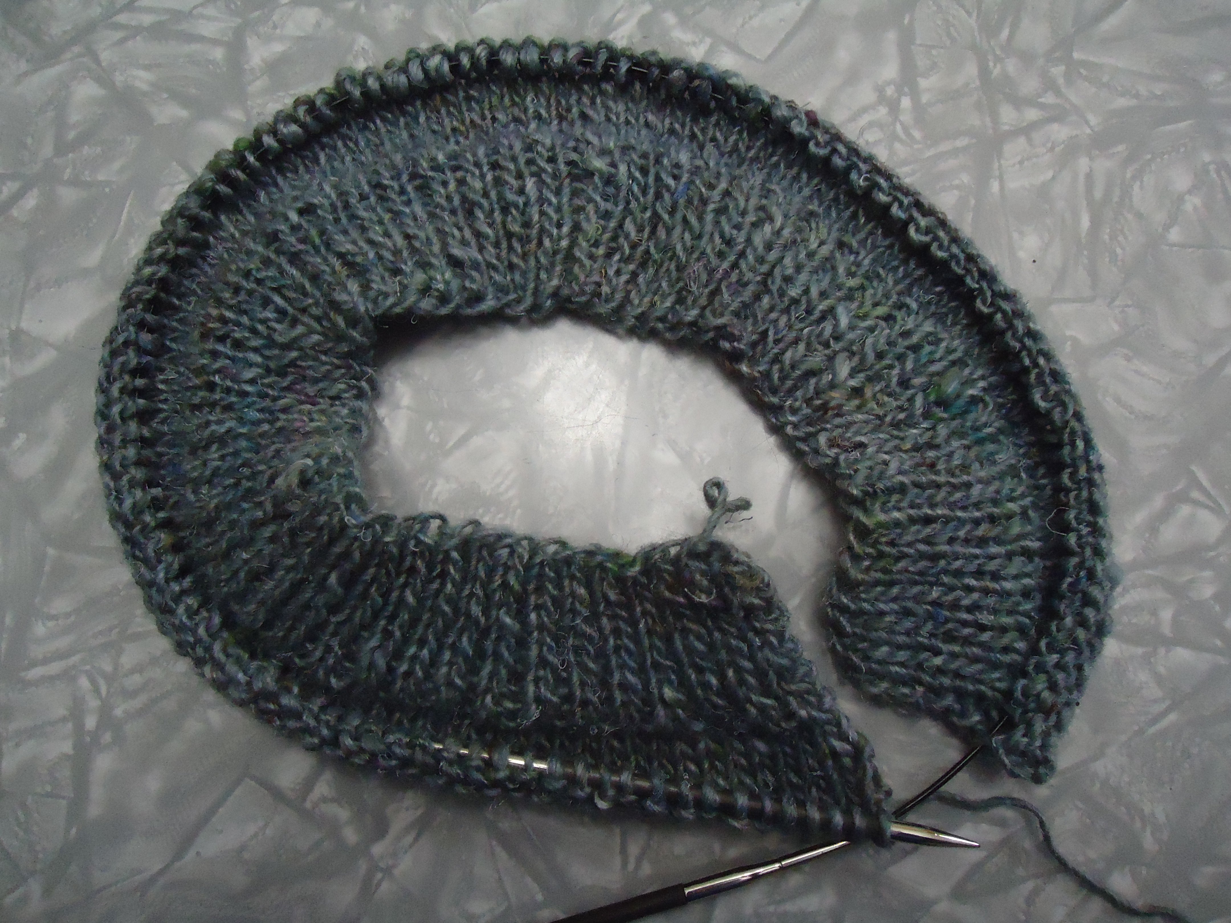 Well, all is right with the world again! In spite of having a couple stops to make on the way home and a few chores to do once we got home, I still got some knitting in. It’s amazing how much you can get done in one episode of Midsomer Murders – around an inch and a half! Worsted weight yarn and size 7 needles rock 🙂