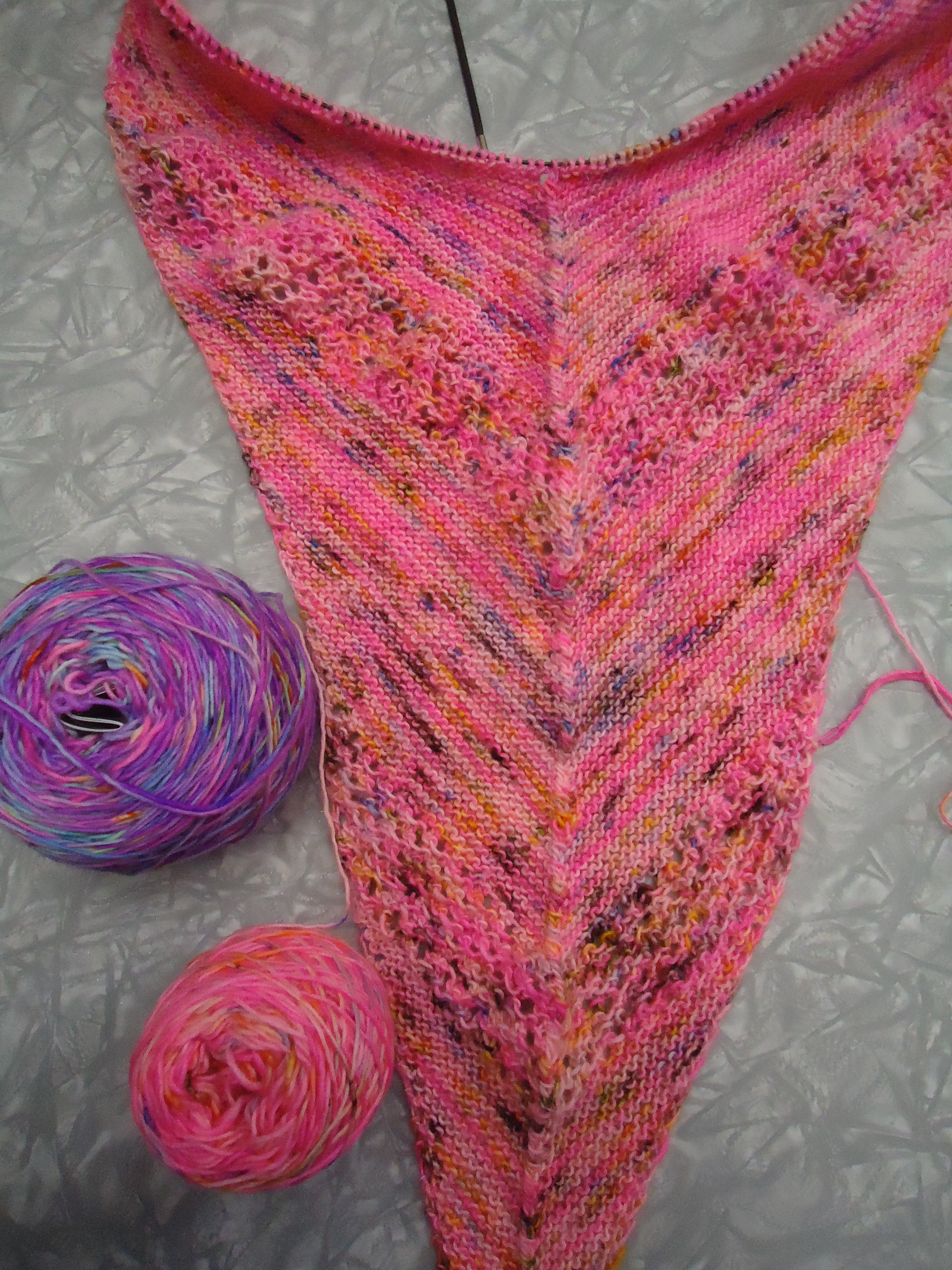 I keep thinking – surely it’s time to fade to the next color. But it isn’t. I did my calculations and checked them several times over. And it isn’t time quite yet. This is, indeed, a LOT of pink. But this is a big shawl. So I’m finishing out this section of garter and then the next lace section, then on to the next color!