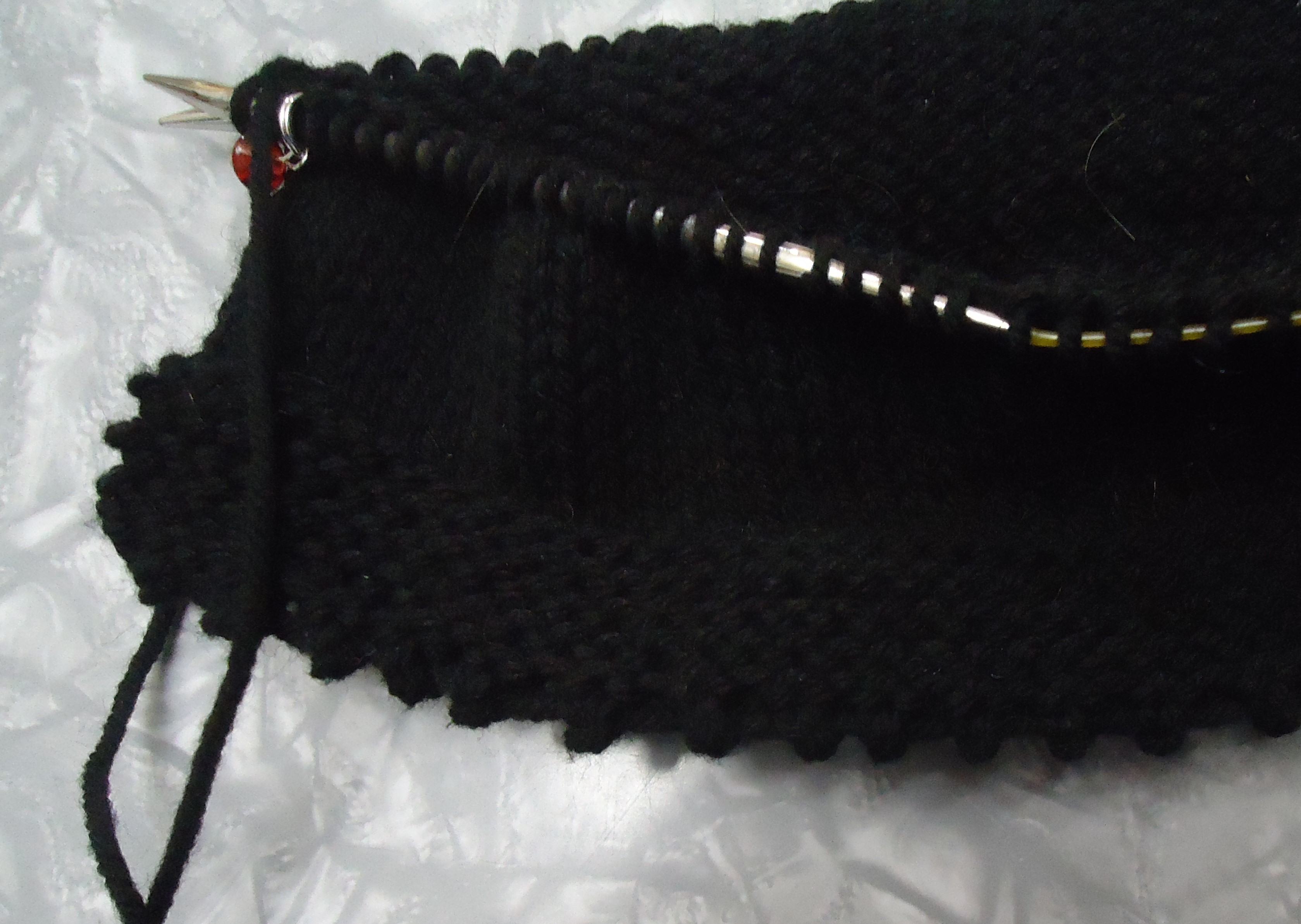 It is hard wearing because it involves three strands of yarn, and looks like a beaded edge, though it’s just knotting worked into the cast on edge. So learning new things already!