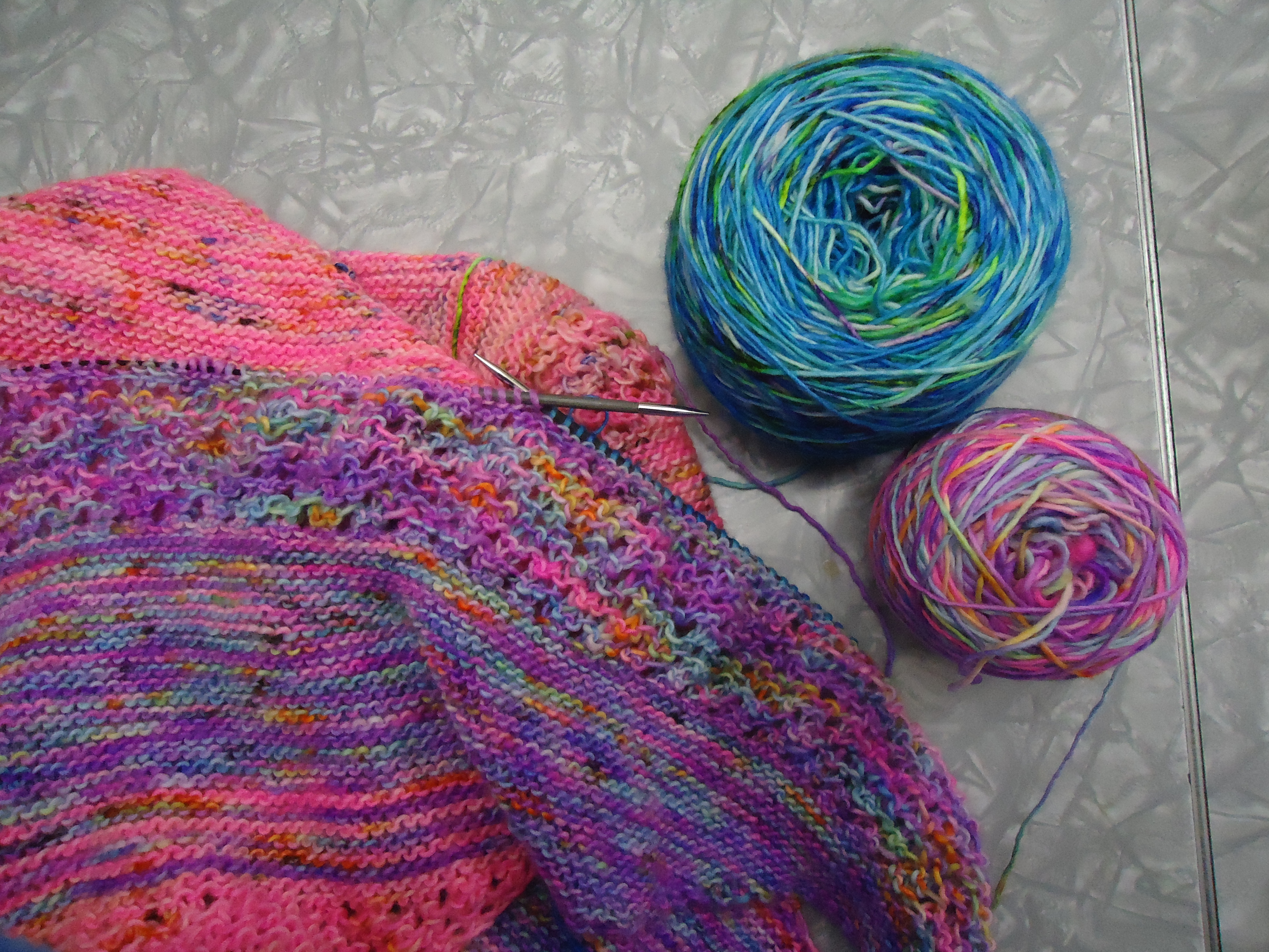 I will be alternating the French Toast (lavender) and Gin and Tonic (blue) for a few rows, than on to just the GnT for a while. I am just enjoying working with this yarn so much! It is Madelinetosh Tosh Merino Light, and is great to work with, in addition to being just really pretty. This is a really big shawl, and I’m at the point where every row is sooooo looooooonggg. But there is a little progress!