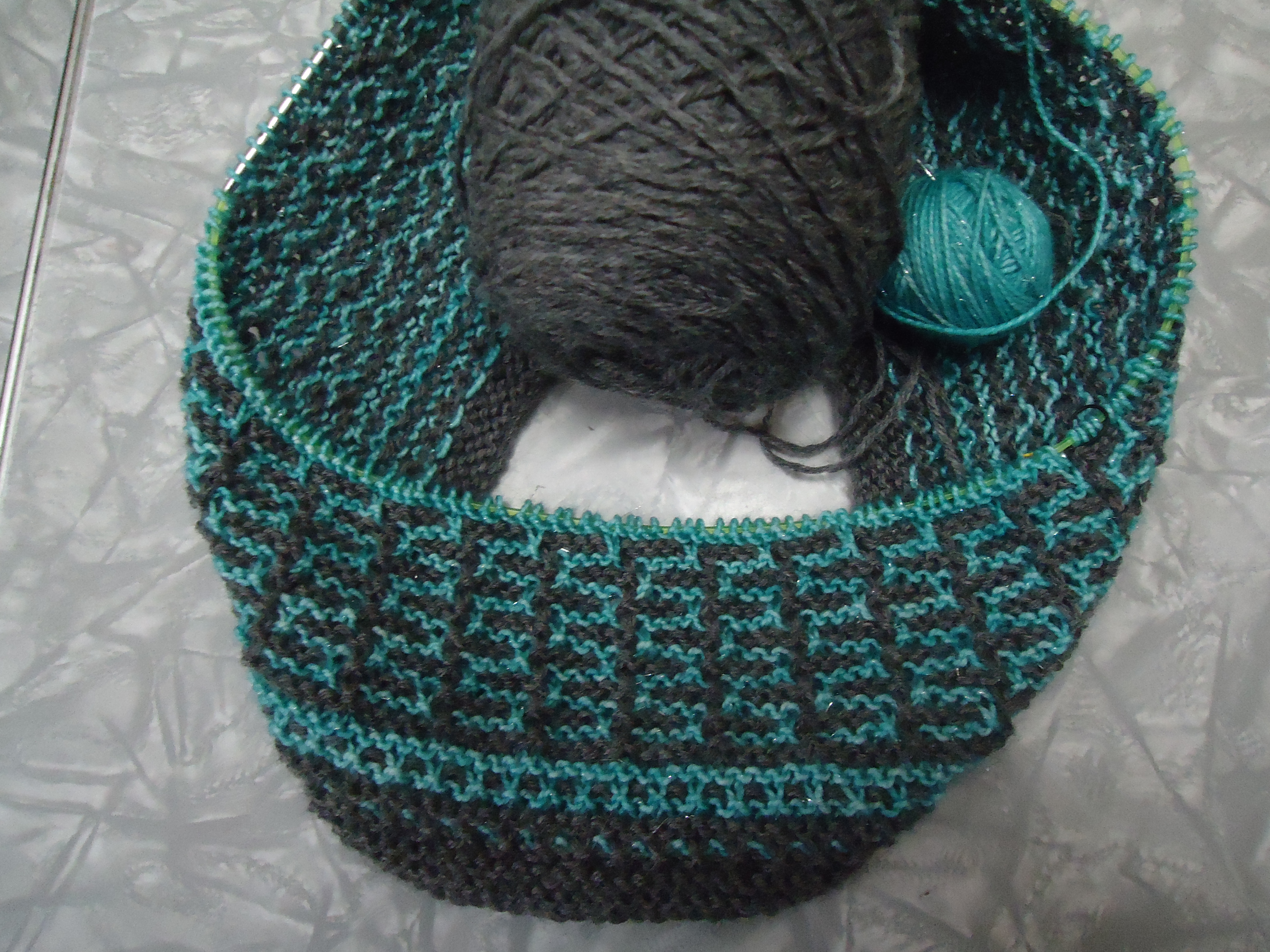 Done with sections one and two of my Colorshift Mosaic Cowl, and just finishing up with the first contrast color! Next up is the central chevrons section with the crazy speckled yarn.