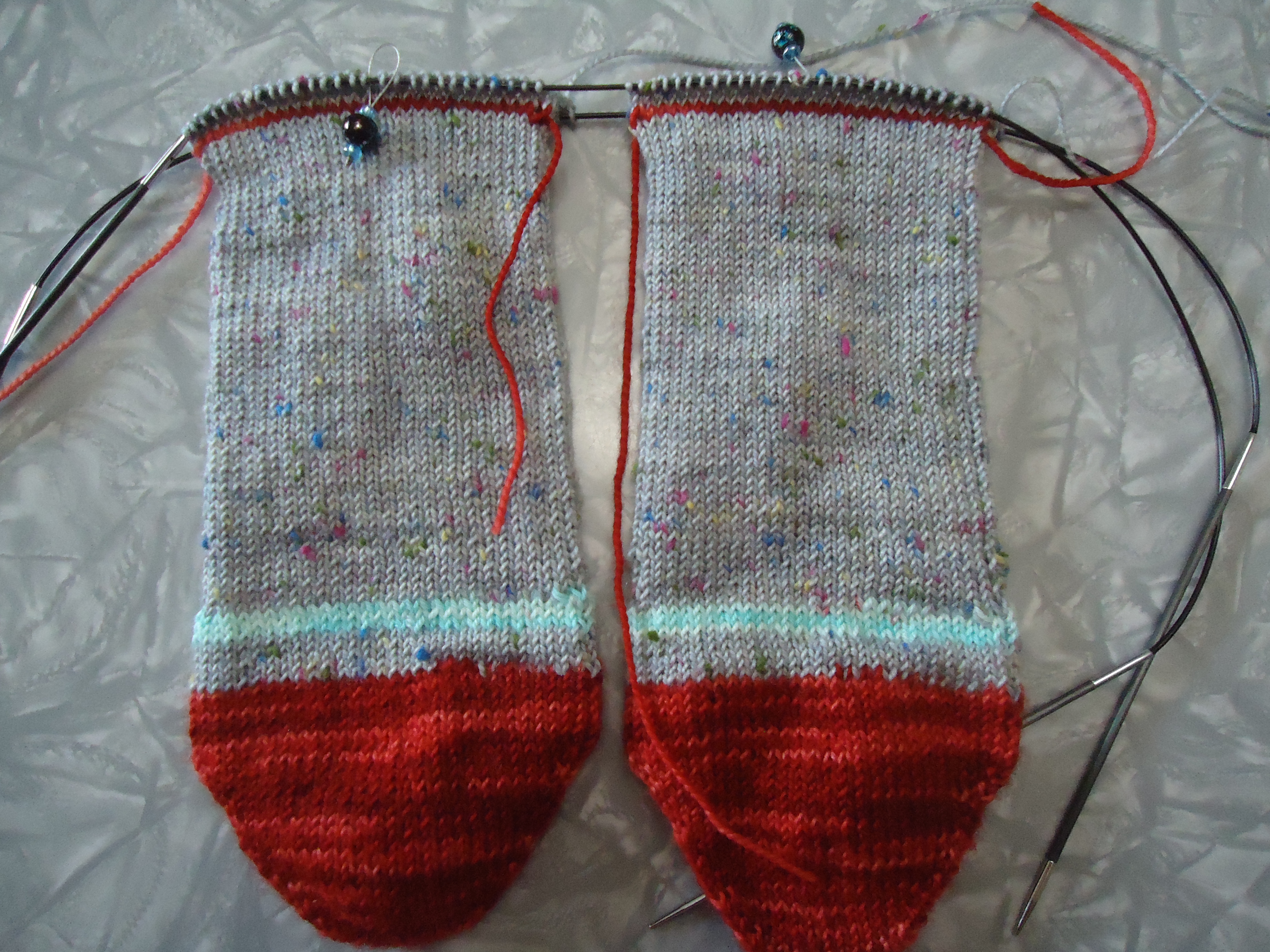 At that point I plan to slip them onto double point needles and do them one at a time. The intarsia part is on the “outside” side of the calf for each sock, so I think for this first try with this technique I will take it easy πŸ™‚