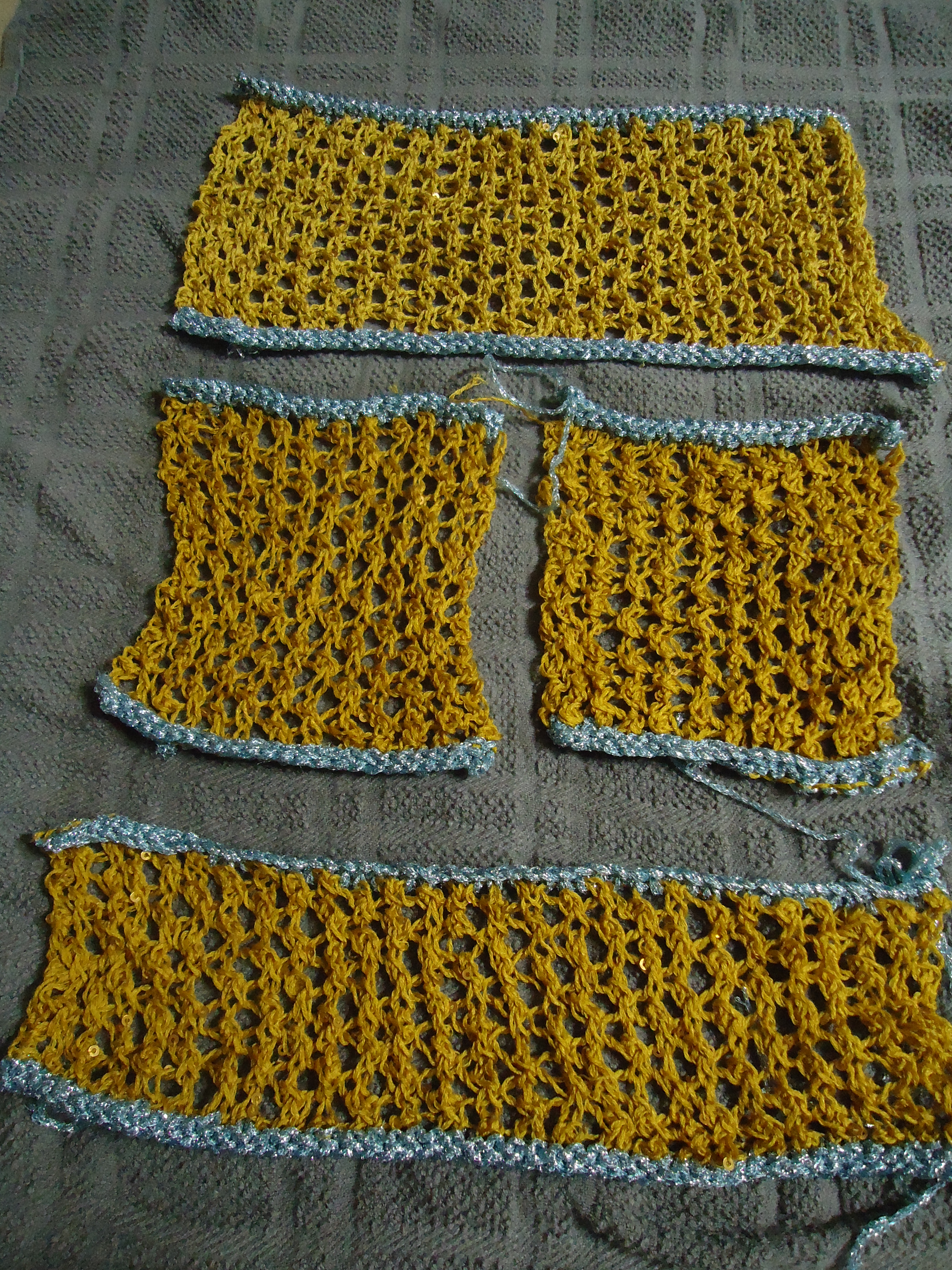 The pieces for Dolores‘ beach cover-up are done and blocking! Hopefully I will be able to get them sewn together tomorrow and done. It should go together pretty easily – there is a back, two fronts, and a hood, and it looks like pretty straightforward seaming. Well, we shall see. This is a very blingy cover-up too – sparkle yarn AND sequins!