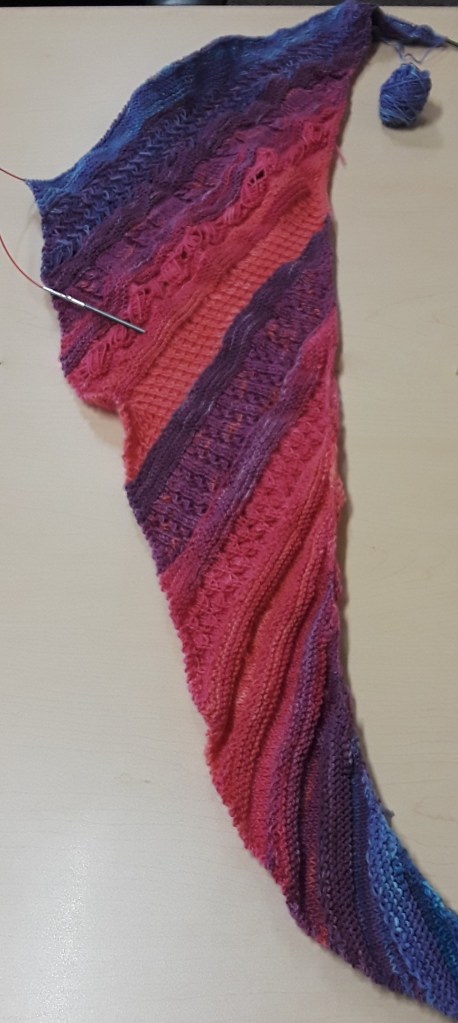 I am at the point where I have to make a decision. The designer has options for a smaller and a bigger version of the shawl, and I’m going to need to decide which way I’m going to go. I suspect bigger because I have the yarn and there’s no particular hurry. But we shall see!