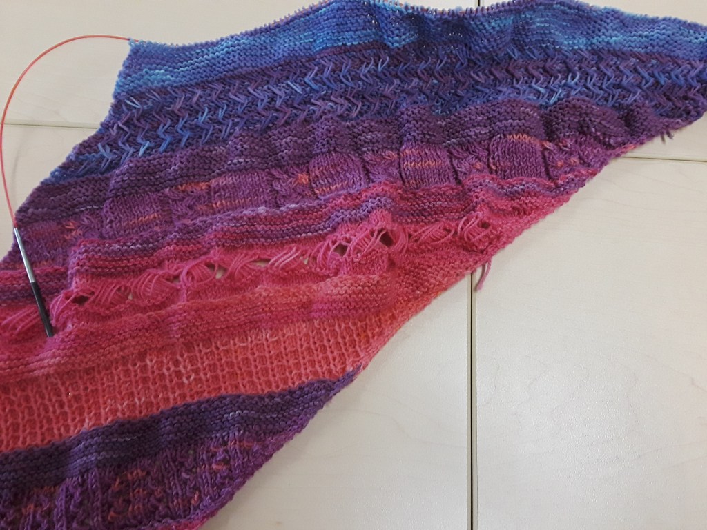 The last time I mentioned my Perfect Blend shawl here was late July, but it hasn’t been hibernating. I took it to work and have been doing a bit here and a bit there as I have a minute over lunch. Although it hasn’t been long stretches of time all together, since I started I’ve gotten a bit done!
