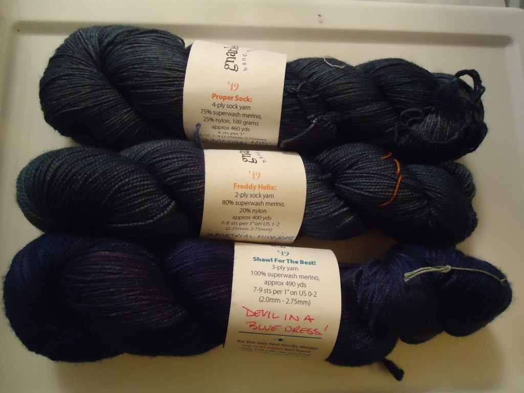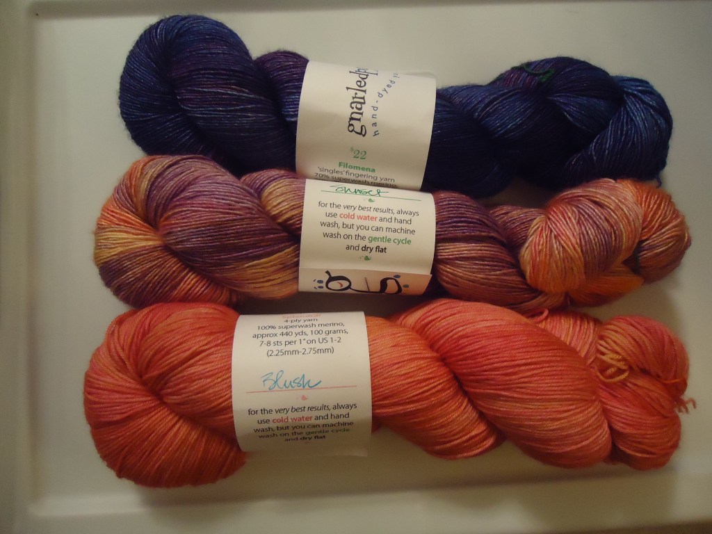 After that, though, is going to be Free to Fly, which I do need to think about. It is fingering weight, which I don’t really have sweater quantities of. I did look at some yarn combinations from stash that I could possibly do as a fade with the birds in a contrasting color. Or possibly I will just get a nice tonal yarn from Knit Picks and go with it. I am really stuck. Here are the skein combinations I am thinking about. Opinions? Please share π