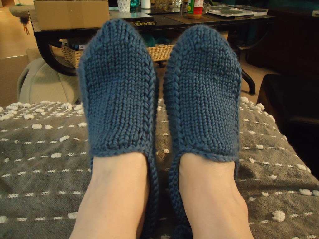 They are an easy knit – they went together in just free moments here and there over the course of the week. They are lighter weight than the felted ones I normally make, but that is OK – they can be warmer weather slippers! And they are pretty cushy, as they are made out of bulky weight yarn – which is another reason they go together pretty quickly.