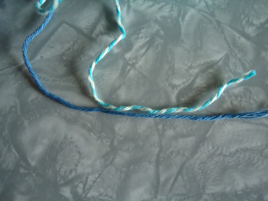 Both yarns are 100% cotton, so that was good. But Rowan denim claims to be worsted weight, while the Crazy Cotton is DK. But looking at strands of them together, they look pretty darn close to me. If anything the denim looks thinner than the Crazy Cotton.