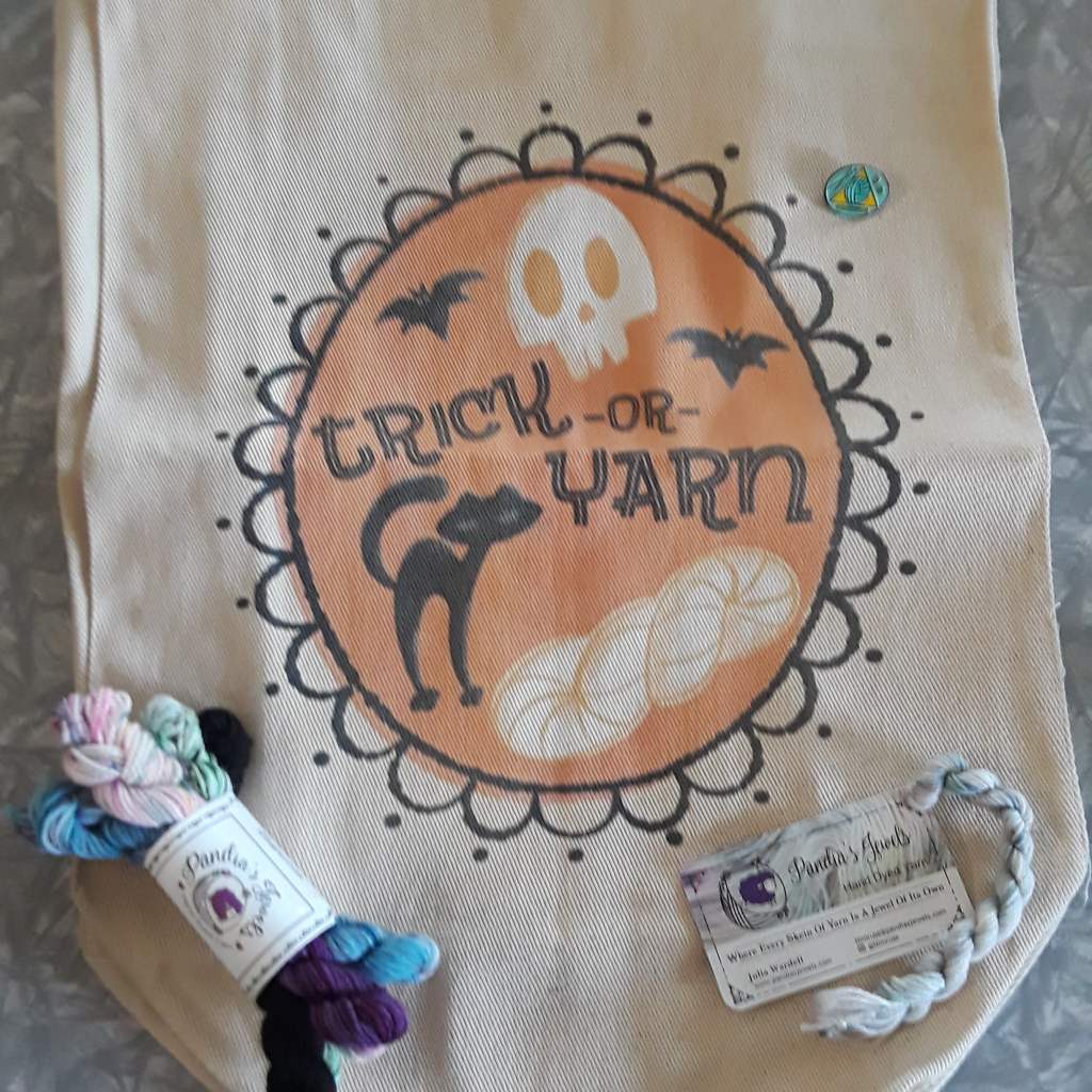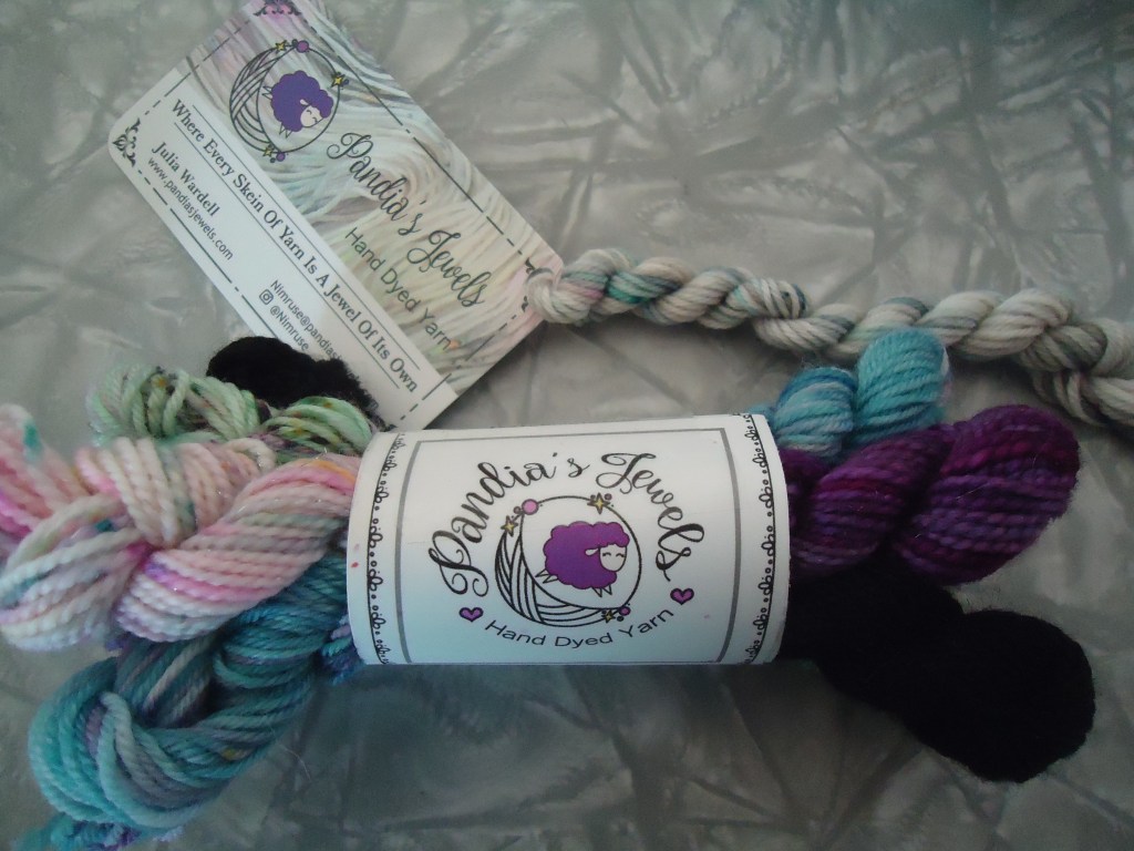 I got a fun yarn shipment recently from Pandia’s Jewels – a really nice Halloween tote bag, some random miniskeins, and an Illumiknitty pin 🙂