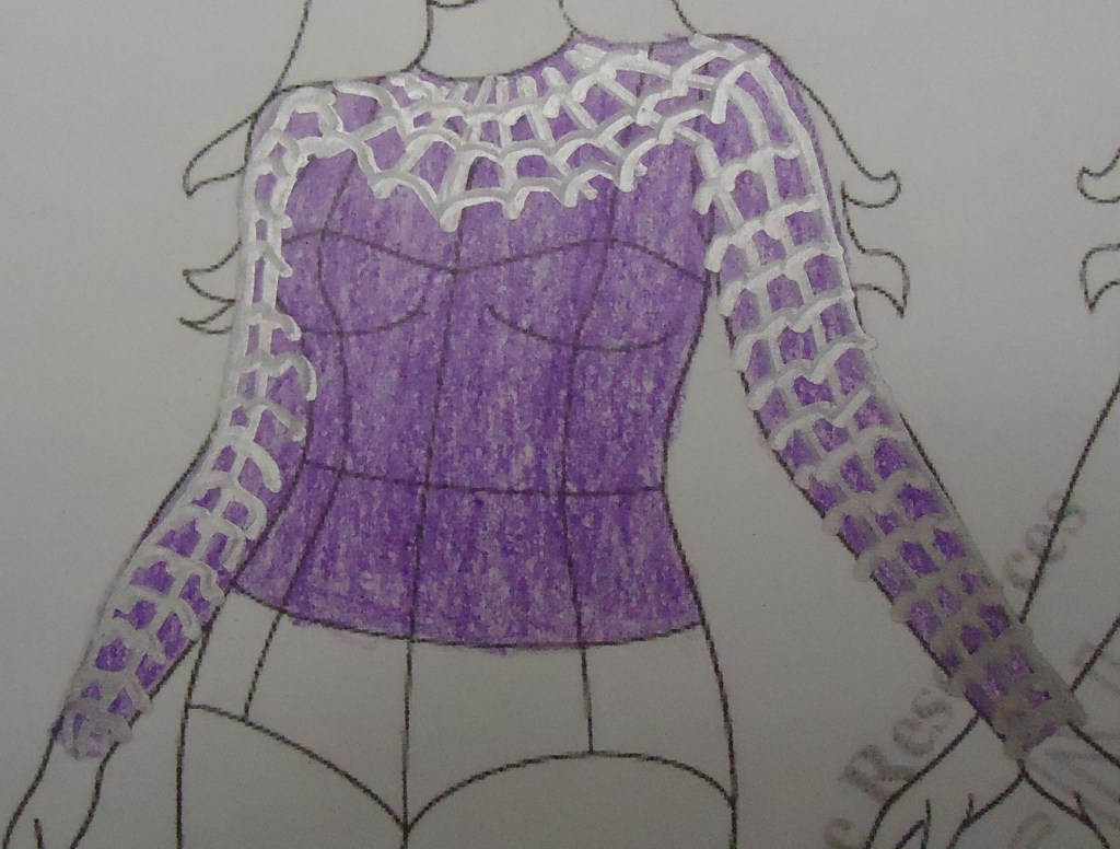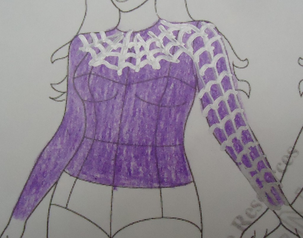 Finally, I am at a decision point with my Arachne. The main modification I was thinking about was adding some web patterning to the wrists or forearms, then I thought about doing it over the whole arms. Then Karen had the idea of doing it just on one arm! So I found some free printable figure template (croquis, if you are talking fancy fashion words) at www.designersnexus.com and colored in the three current notions.