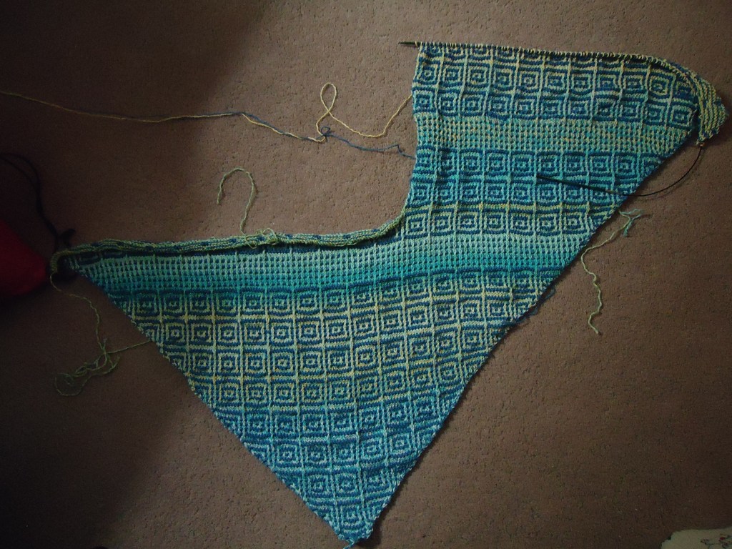 Also, I’m trying to save some of the blue or aqua yarn for the collar. I don’t care for yellow, and it doesn’t look good on me, so I’m trying to manage where it is on the garment. That probably sounds goofy, but it’s true. I suspect there will be a bunch of yellow cotton yarn leftover from this project. Maybe dishcloths?