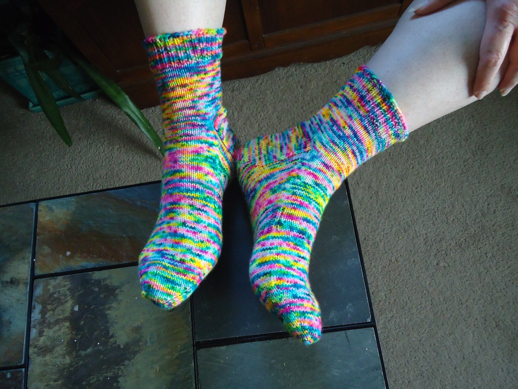 The yarn is Radioactive Rainbow from Knitted Wit, and I didn’t really use a pattern, it’s just my plain toe-up sock recipe.