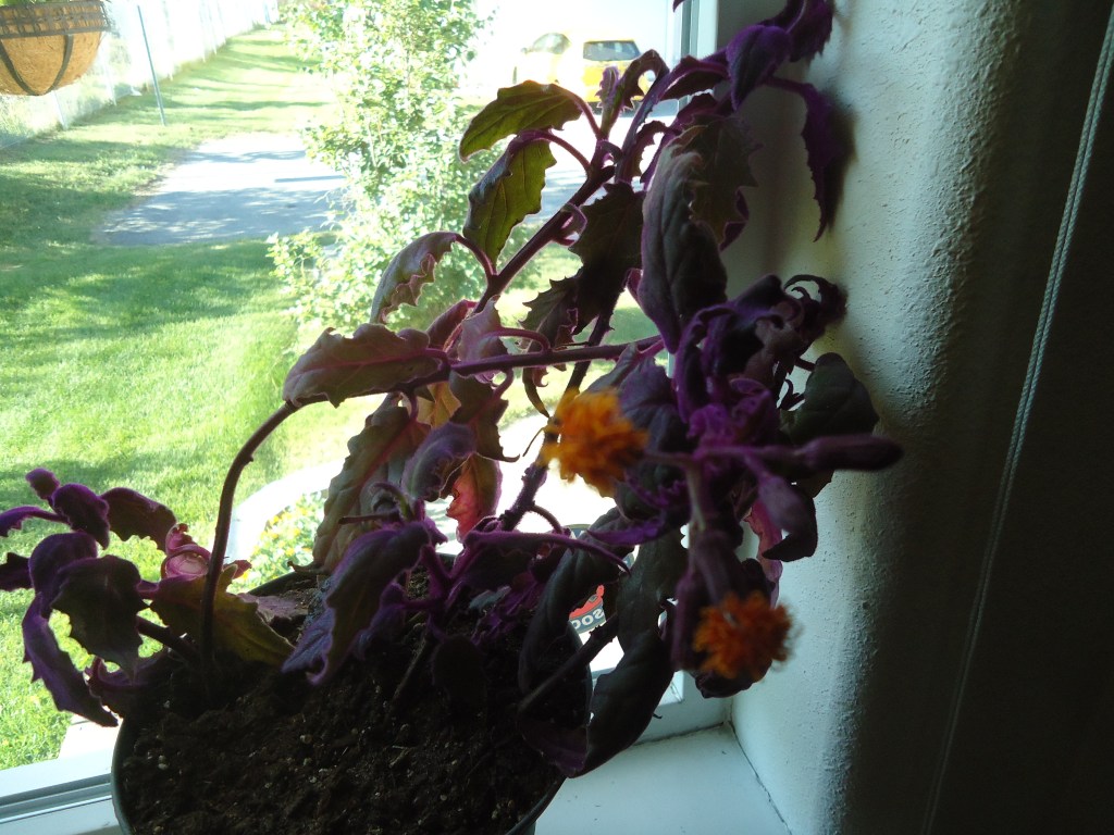 And finally, I have had one of those creepy purple fuzzy plants going for a couple of years now, and this year it is growing flowers! They are likewise creepy – orange fluffy things that are all growing from one area of the plant. They are tough to get good pictures of!