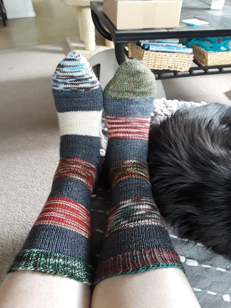 They are done! I managed to use up pretty much all of both mini-skein sets, and quite a bit of the charcoal yarn, so that is a help to my sad attempts at stash reduction. They are reasonably festive, and I am pretty happy with how they turned out!