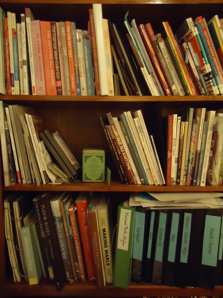 It’s hard to make out in the photo, but I have knitted samples stuck in between pages and between books, and a truly apocalyptic stack of patterns and samples sideways on top of some of the books. I really need to take a day and whip it back into shape. 🙂