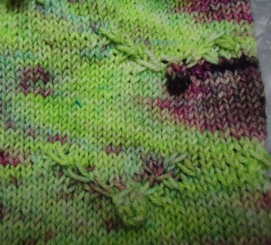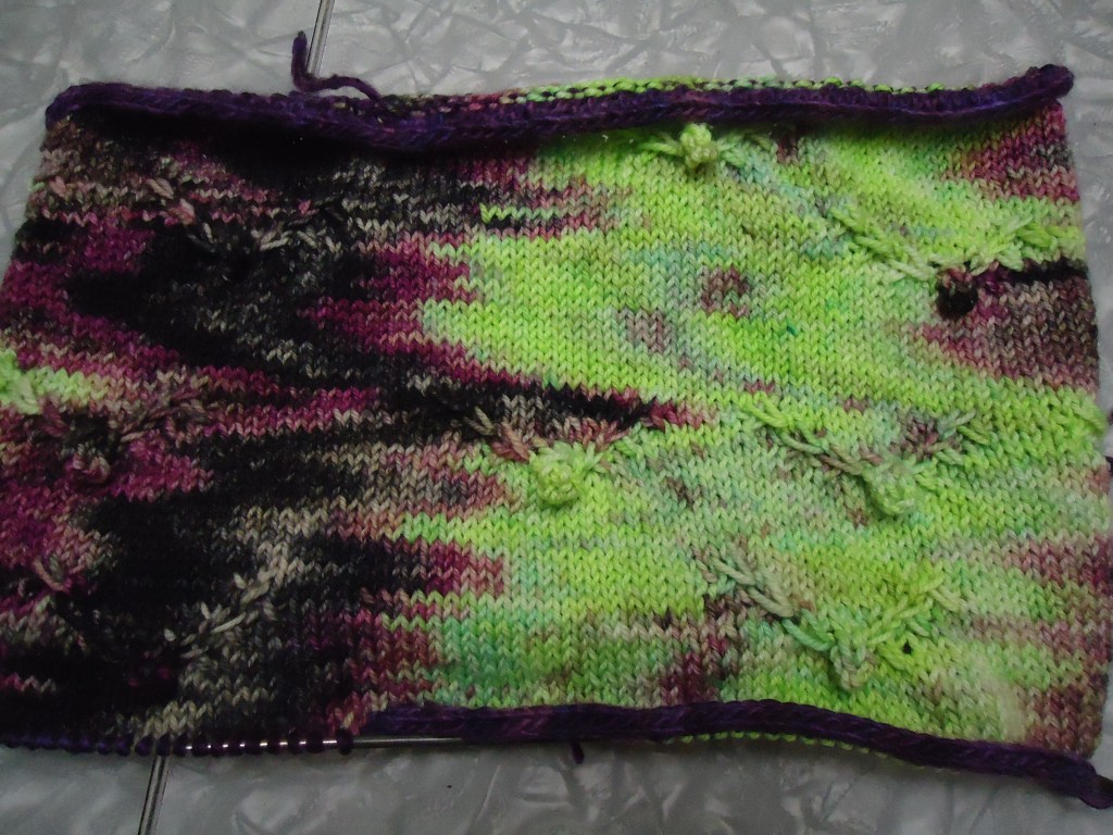 My bat cowl is coming along pretty well! I’m actually binding off the lower edge right now, but it may need more finishing. I tried a couple different edge treatments, and none of them was great. The last thing I tried is an i-cord bindoff with a different but coordinating purple yarn that looks halfway decent. As you can see though, it is rolling. Hopefully, it will block out, but if not, I may stitch it down to the back. Not sure yet. Anyway…