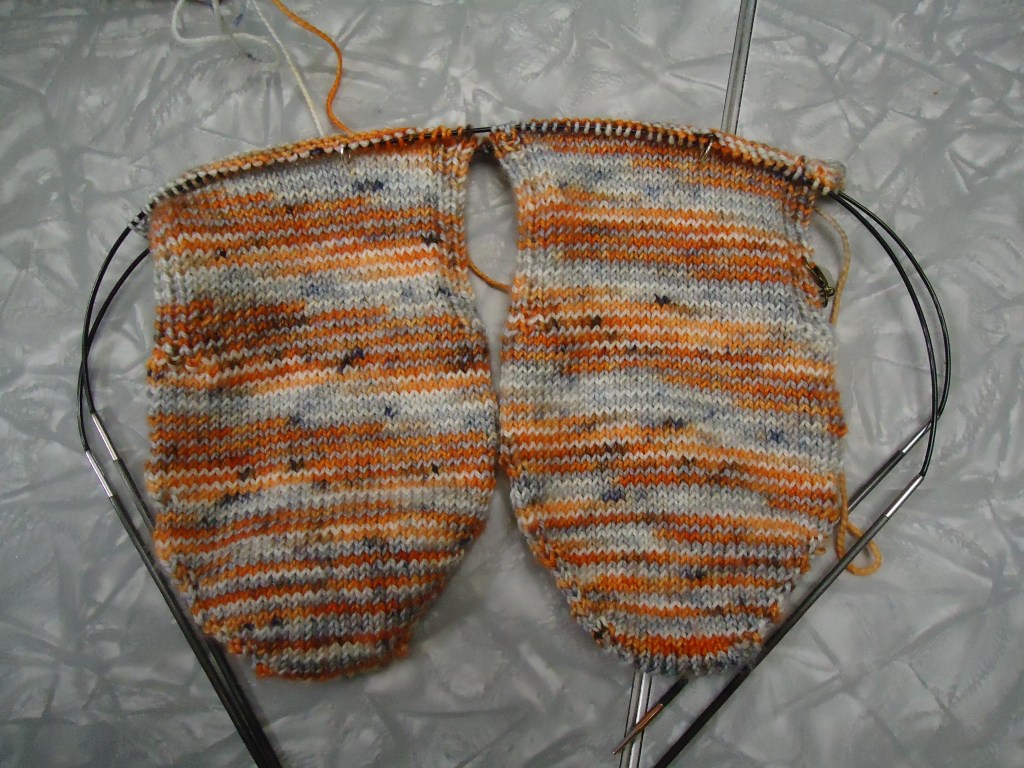 The Haunted socks are moving along. I have maybe an inch and a half to do on the feet, then the heels, then on up the legs until I run out of yarn or get bored with them 🙂