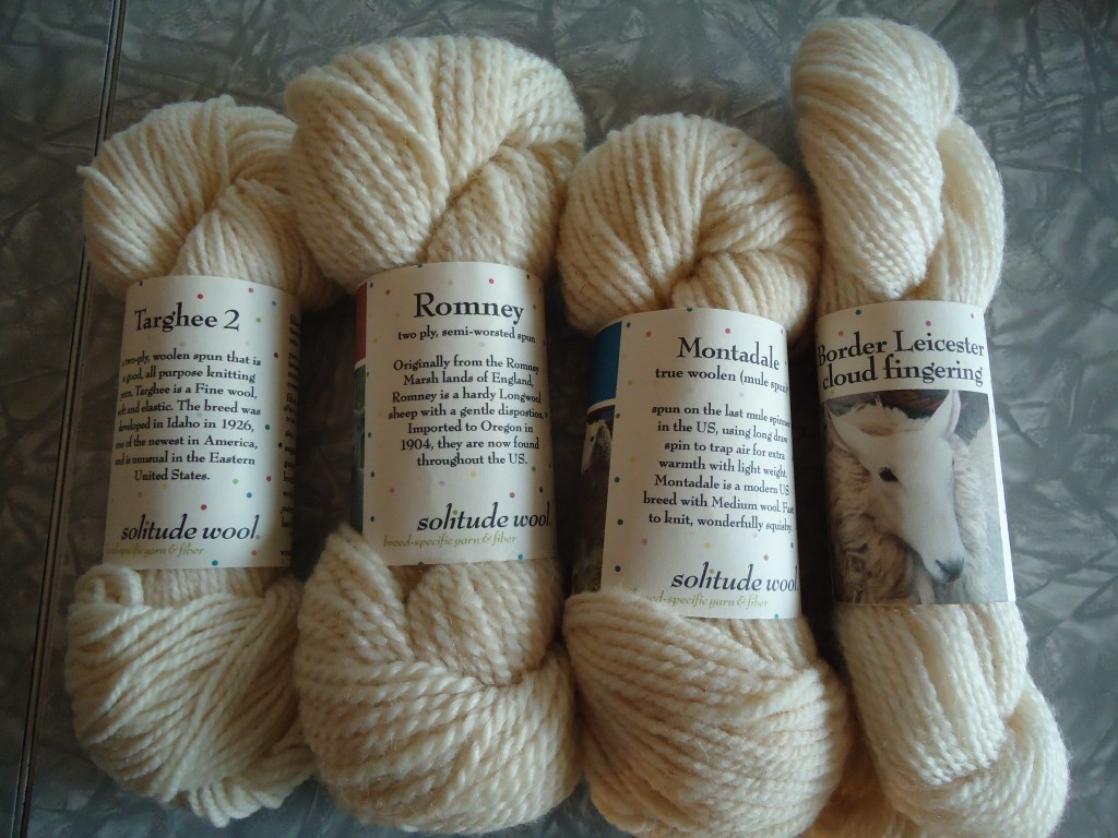 The yarns are from Targhee, Romney, Montdale, and Border Leicester sheep and are from Solitude Wool. First impression on getting my hands on this yarn is to notice the differences in the feel of the yarns. Each definitely has its own characteristics, which I am excited to explore more The labels on the skeins are everything a yarn nerd could hope for. Characteristics of the sheep and the wool, farm the yarn comes from, details about how it was spun, and specs on the yarn itself (weight, length, suggested needles size, etc.)