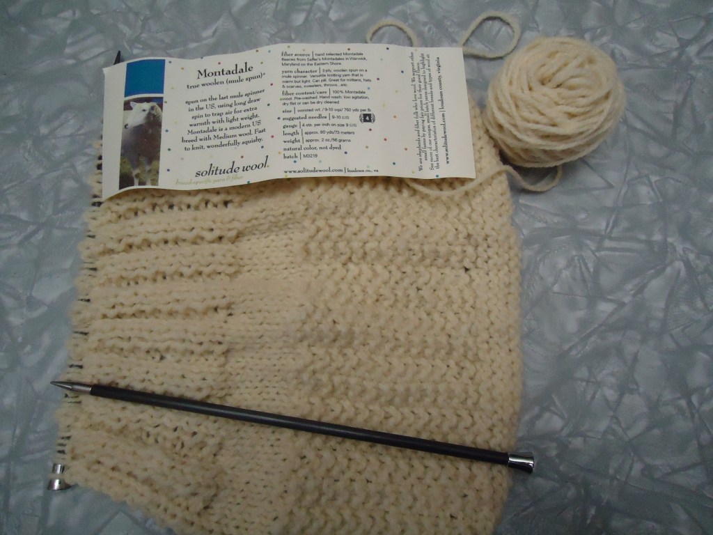 I started with the Montadale yarn. It is a toothy yarn – I wouldn’t call it rough, but it’s not super soft either. It is a nice firm yarn, so it is showing off the stitches really well. I’m very happy with how it’s going so far 🙂