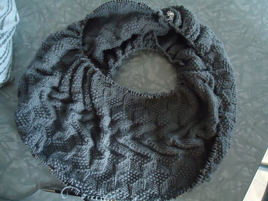 You can just about tell where the blocking stopped, can’t you? Op Tiki (Ravelry link) is coming along – I think I have two more repeats to go!