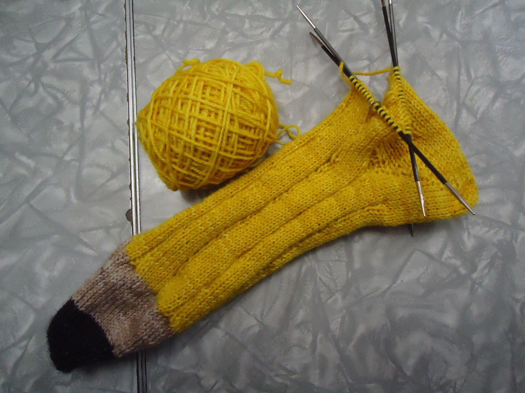 I have turned the heel on my pencil sock, and started the leg. Now it’s straight knitting until I switch to the yarn for the eraser part!