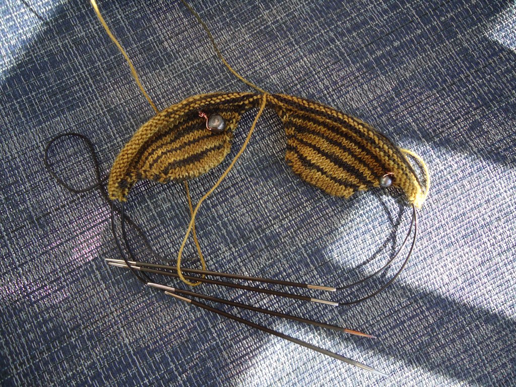 The yarn isn’t actually self-striping, it’s just coming out that way right now. I think once they get to their final stitch count it will be mostly tan with black stripes and probably some pooling.