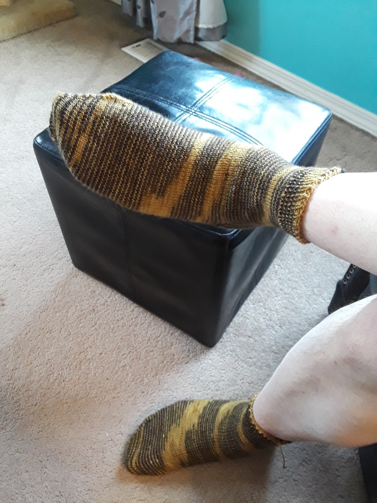 The yarn is from a sock club from years ago, so I don’t know the dyer or colorway. I did them toe up starting with a Turkish cast-on and did a short row heel. My usual basic sock 🙂 Next up – Elizabeth Montague socks from the KDD Bluestocking club!