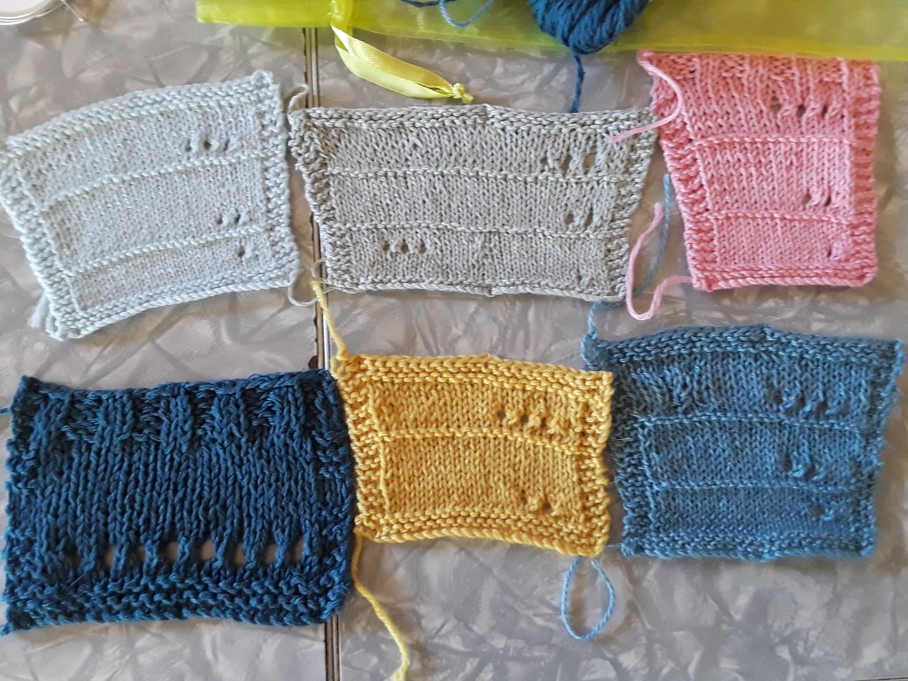 – Light blue in the upper left – Sunday – a light fingering weight yarn in 100% merino. This yarn is pretty soft, with a little bit of texture to it.
