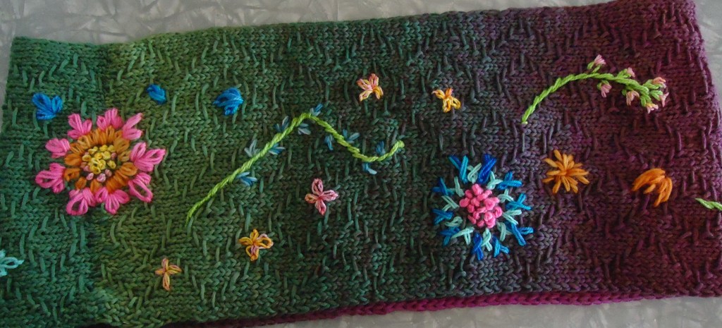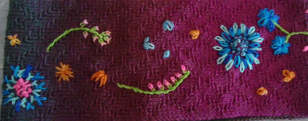 I did change it a bit. It was supposed to be a scarf with a clever fold in one end for securing the other end, but I just couldn’t face that much knitting on it, so changed it to a cowl. It is a really lovely design with clear directions. and I really like the stitch pattern and the yarn. This really was a case of it being me, not the pattern. I just finished a never-ending project (Bonbori shawl) and really needed something quick to do! I did do embroidery all over it, though , instead of just at the end. And the technique this month was embroidering on your knitting, so I feel like that covers it π
