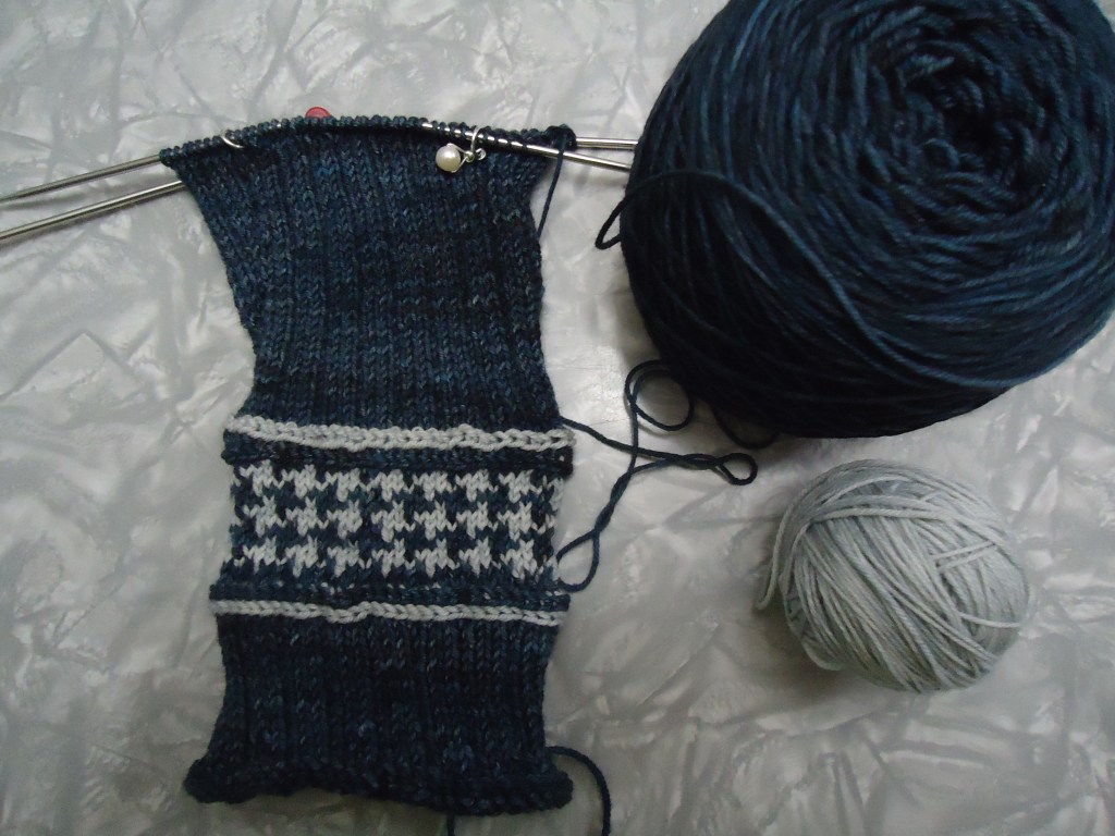 The pattern is Burnished Mittens (Rav link), the July project in AC Knitwear‘s Confident Knitting club. They were designed by Lily Kate France, and are an enjoyable knit. The technique for this month is Vikkel braids, which you see there on either side of the colorwork part. The yarn is from Old Maiden Aunt, which has a really lovely depth of color and is really nice to knit with.