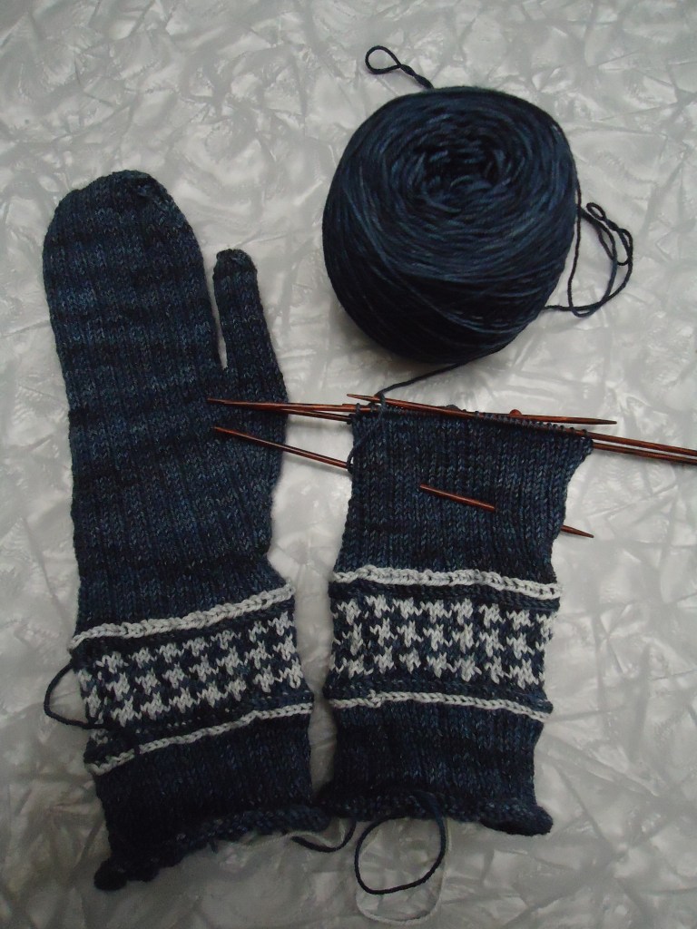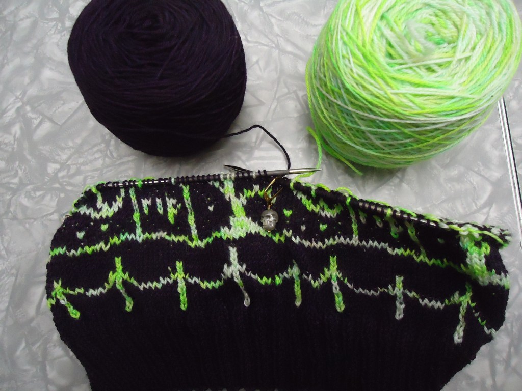 The other project is my Cemetery Drive cowl. That one is really moving! I got an unexpected length of knitting time over the weekend, and as a result got around halfway done with the colorwork part. I’ve got a good long time to get this done though, so may put it aside for the next few days to concentrate on the mittens.