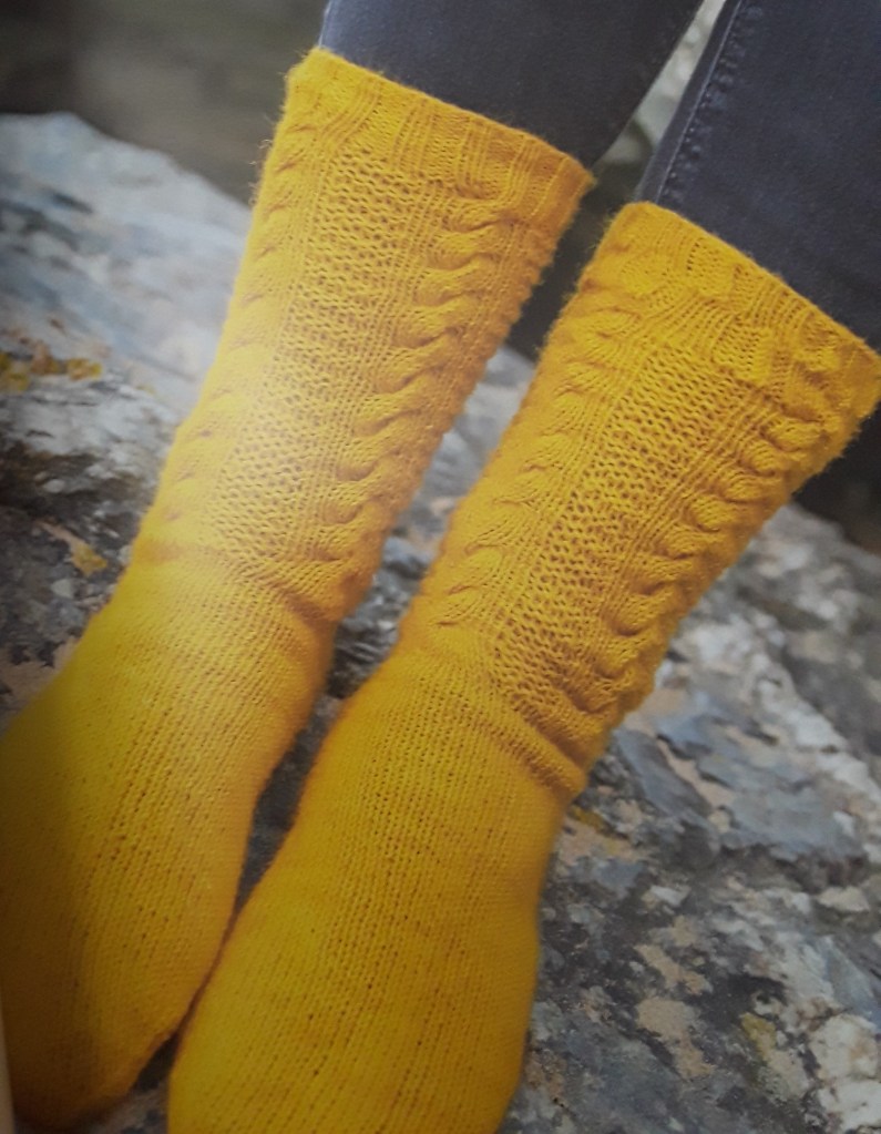 Some of the patterns are pretty straightforward accessories embellished with gansey-typical motifs or stitch patterns. There is a cowl, some fingerless mitts, a shawl, and these socks: