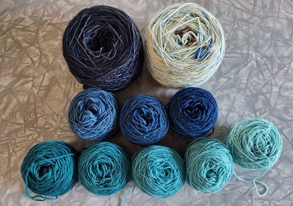 The first clue dropped today for the Ocean Moon MKAL and my carefully set plan has fallen apart. At least partially. I didn’t have enough of one of the yarns I chose, and now that I see the first clue, another one of the yarns will not work for the pattern. Augh! Why didn’t I just buy one of the lovely yarn kits that many, many dyers created for this project again? Anyway, here’s the current yarn lineup.