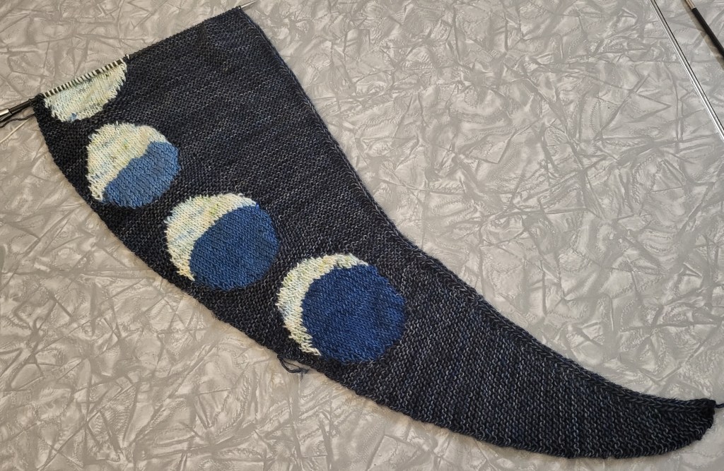 Clue 1 of the Ocean Moon MKAL (Ravelry link) is done! The next clue completes this crescent. What is coming next? I have no idea, but I’m looking forward to seeing it 🙂