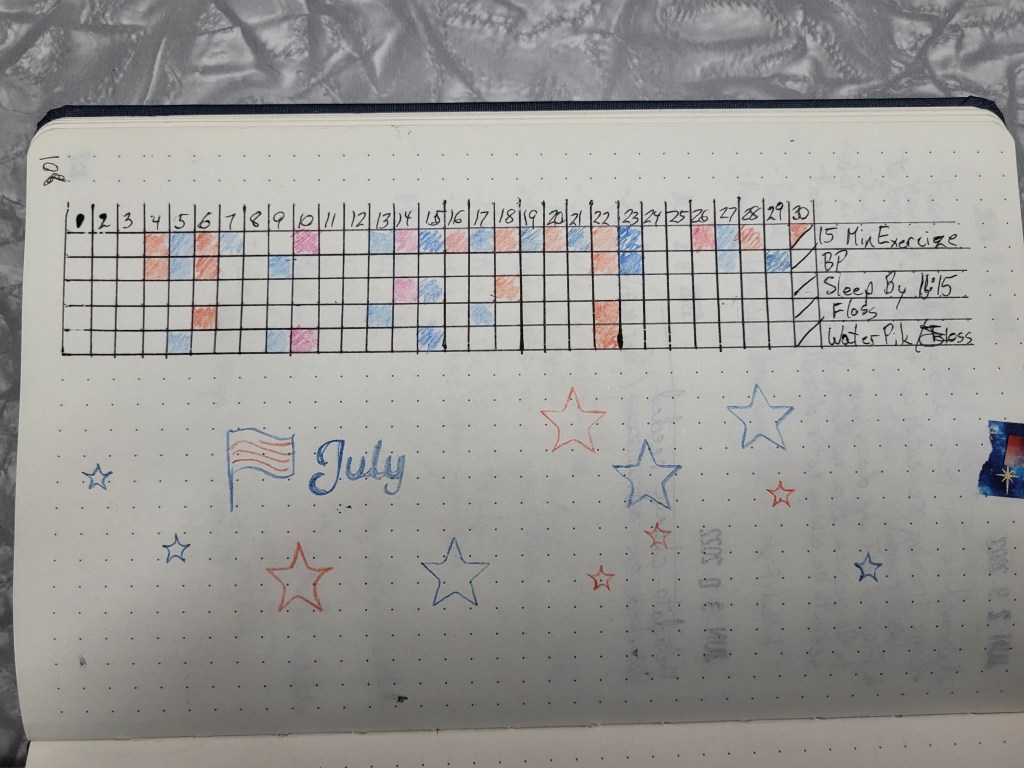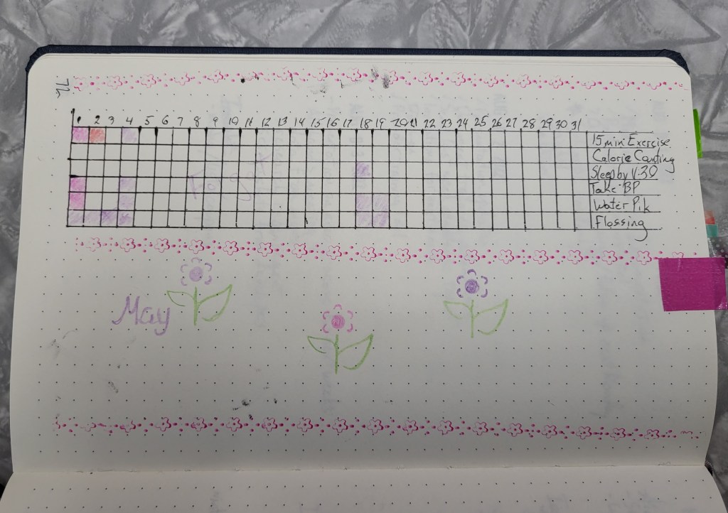 One of the things you can do with bullet journaling is work on building habits. This can be a short term or long term effort, but it’s a pretty straightforward process. Decide what you want to change or improve, and from there come up with specific actions. Like for me, one goal is to work on taking better care of my teeth. They’re in good shape now, but in danger of not being so if I didn’t start doing some dental care things. But just tracking “Take care of teeth” is kind of vague. So I am tracking “floss” and “Use water pik” as the specific things I need to do. I’m already brushing as recommended, so that’s not the issue.