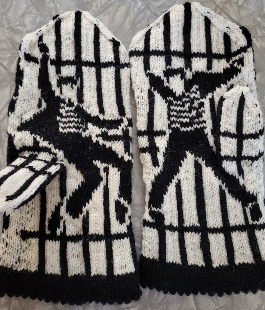 The pattern is called Elvis Presley, (Ravelry link) and is by Lotta Lundin. I used Knit Picks Palette in white and black. I used less than a skein of each to do this pair of mittens. I’m happy with how they turned out! Also, I have to thank my Mom for the assist in weaving in ends, which I have a lot of trouble getting myself to do π