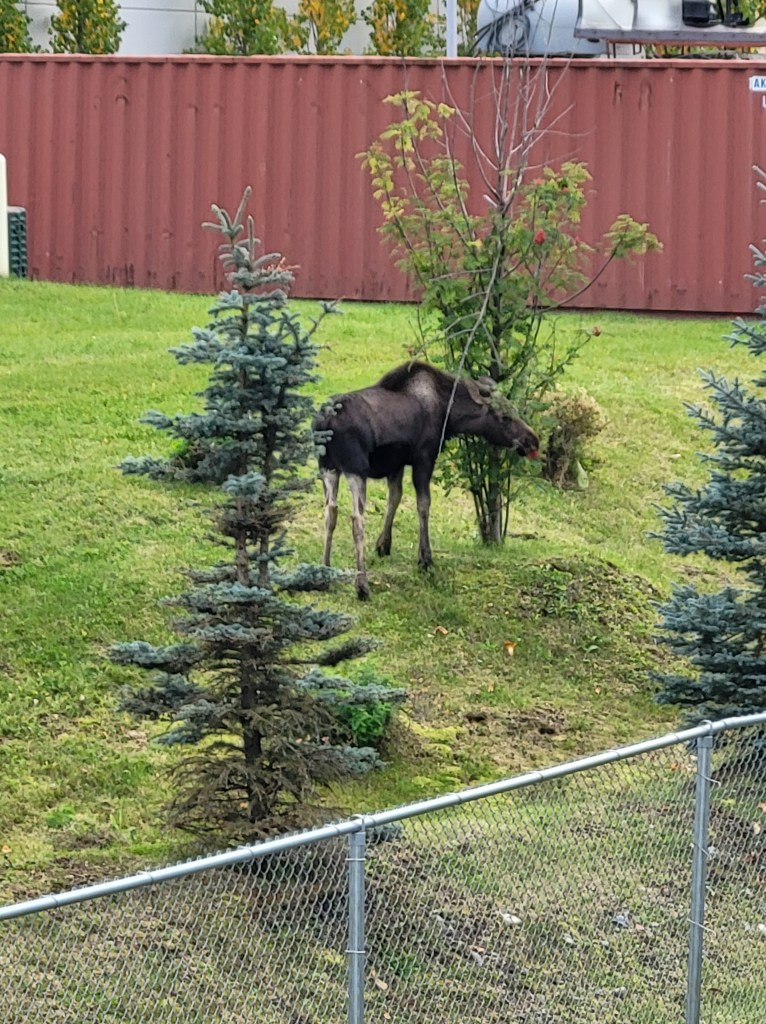 As Liz at Highland Heffalump said “There’s a moose loose about your hoose!” This guy was just over the fence from my yard. It’s always a thrill to see them wandering around 🙂