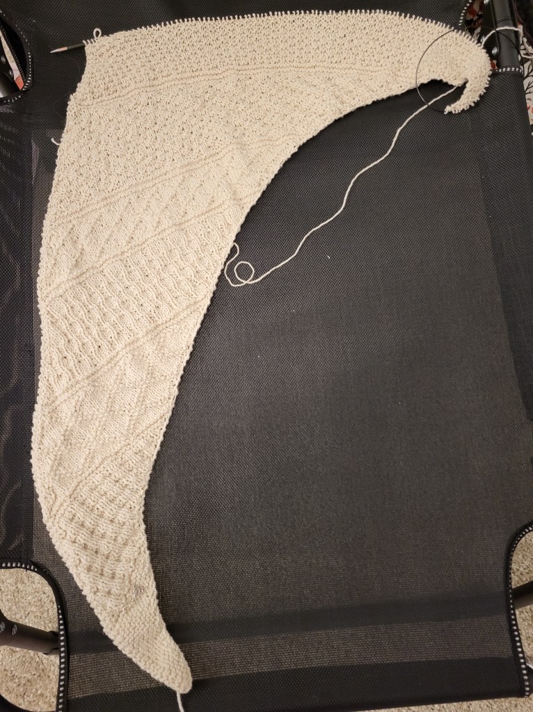 Celtic Mist shawl MKAL (Ravelry link) has been going for a while now, with new stitch pattern sections to knit each week. This was week 6 of 8, though the designer recently promised a 9th bonus stitch section! I am knitting this one along with Alissa, and am really enjoying this one, and looking forward to wearing it when it is done 🙂