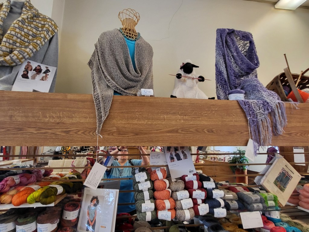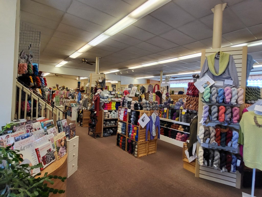 Intertwined is on the second floor of an old fashioned department store in downtown Two Rivers. It has a great selection of yarns, books, tools, and patterns. There are lots of sample garments displayed throughout the store, and it also features a section for a few other crafts, such as macrame, beading, and embroidery. They have a lot of regular yarns – brands like Berroco, Cascade and Lopi. But they also have fancier yarn from dyers like Wonderland and Dream in Color, along with yarn from some smaller dyers.