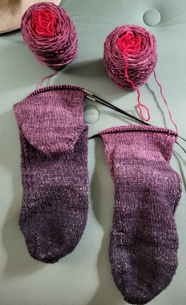 My socks are progressing at a good rate! I have turned the heels and making my way up the legs. Normally I just go until I get tired of knitting a particular pair of socks. With these I’m planning to use up ALL the yarn. I don’t want to waste any of that lovely red at the end of the gradient. I’m enjoying this project – it’s fun seeing the gradient progressing, and I love how fast these are knitting up!