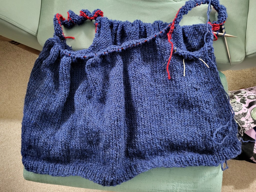 I’ve gotten to creating the opening for the armholes started doing the yoke rounds. I have a few more rounds and the start of decreasing, and then I get to start the design! Still debating some of the colors for the yoke pattern, but I am happy with it so far 🙂