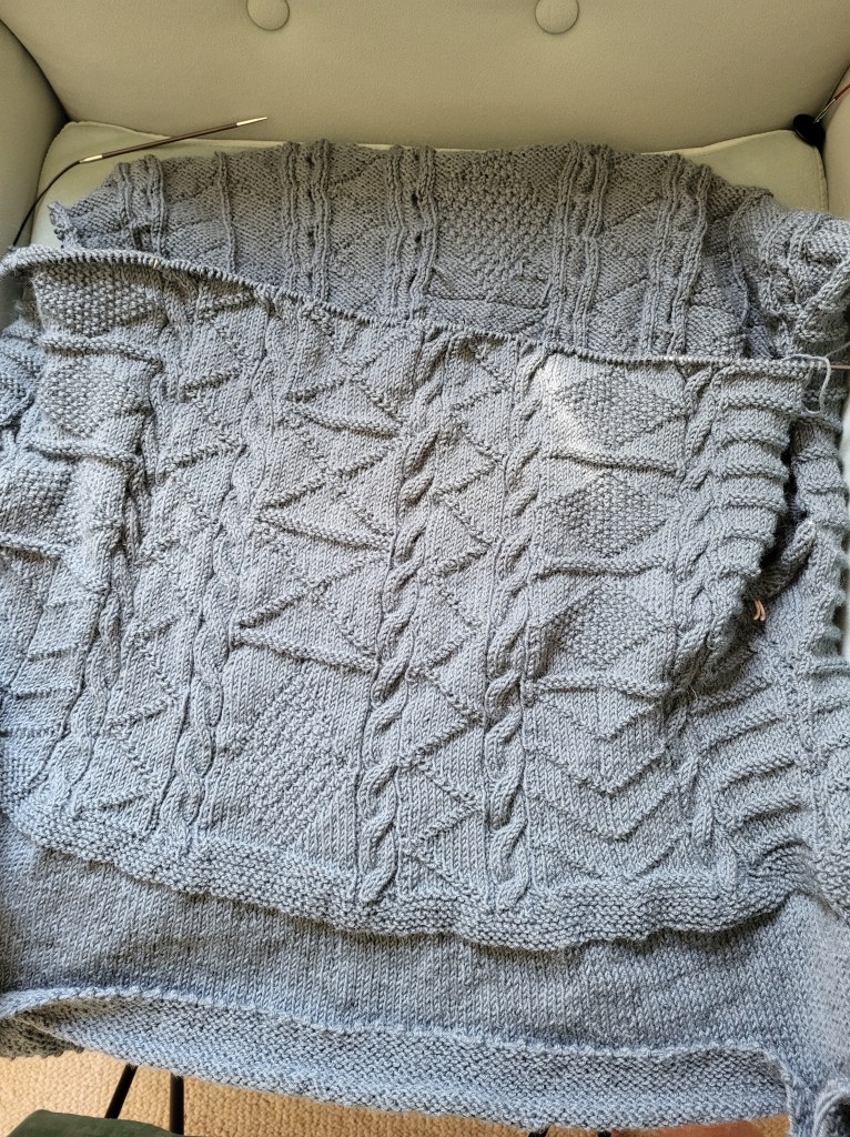 Day 5 of Aran Sweater, done with the back. (Worsted weight, size 7 needles)