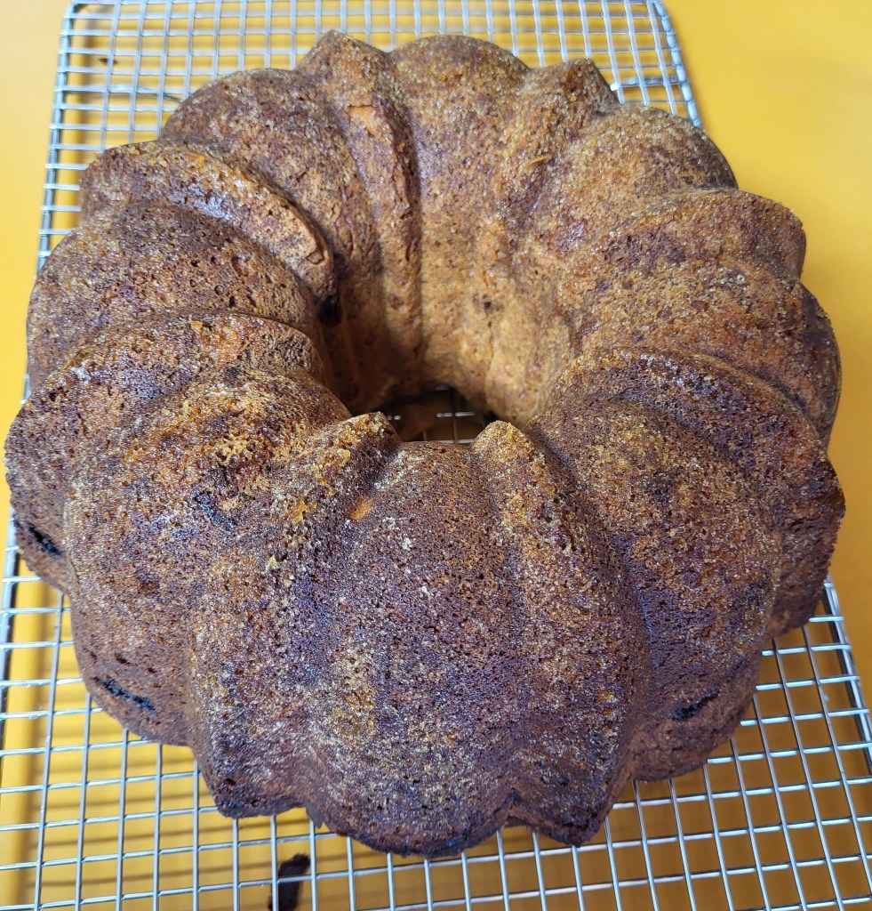 This is the recipe I used, from the Soulfully Made website. It does have a fair number of popups and so on, but it is a good recipe. I did not do the drizzle on the top. but otherwise followed the recipe as given. I was a little nervous about it because there isn’t any liquid per se – just eggs and sour cream, but it turned out really moist but not stodgy. So that worked out!