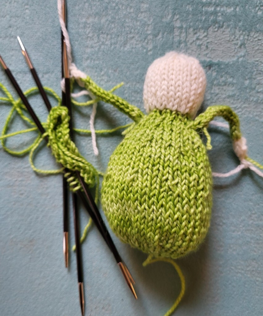 Getting close on another little witch! This one is for my SIL, who loves lime green. I just need to do her hat and her cat. I’m pretty sure I have a mini-skein of the right color, so I just need to fish that out of stash. I think after this one I will make a pink witch with a fluffy white cat for my cousin Amie. Then that will likely be it. Maybe I’ll do some little knitted pumpkins – who knows!
