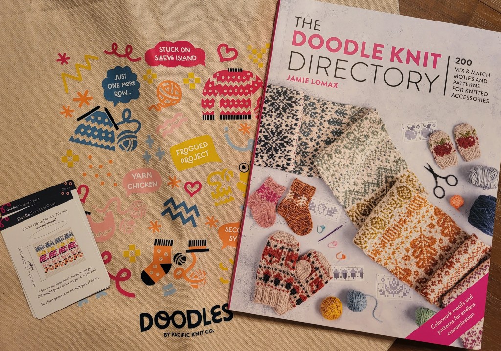 Jamie Lomax of Pacific Knit Co. has consolidated all her doodle knitting concepts and basic patterns into a book, and I am here for it! I pre-ordered it from the author, and got the bonus items you see here – a tote bag and a little limited edition set of knitting related doodles – a yarn chicken, sleeve island, and things like that.
