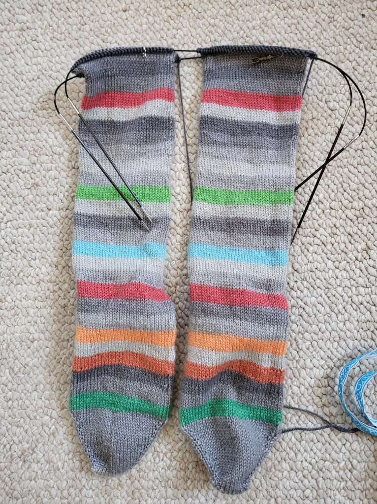My Astronomy socks are almost done – just one more stripe then the ribbing with some more of the toe/heel yarn.