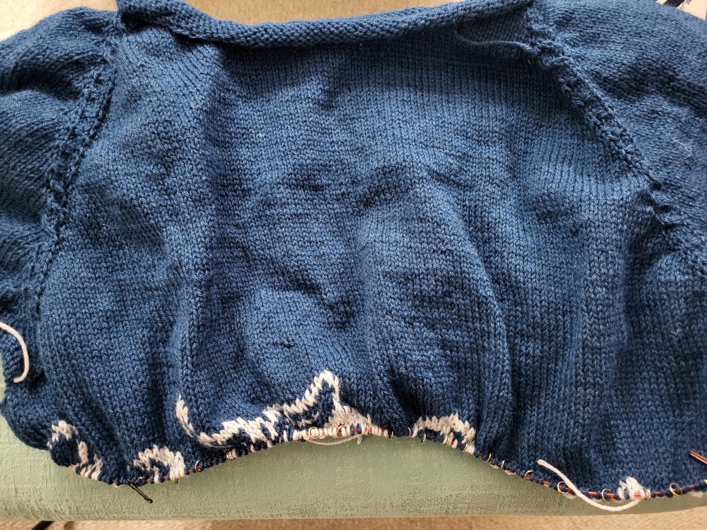Melville (Ravelry link) is moving along! I have just started the colorwork, which was quite a thrill. I don’t think this project will move along particularly quickly, but I’m enjoying seeing the pattern develop. I like the contrast between the main and pattern color, so I think the colorwork will stand out nicely.