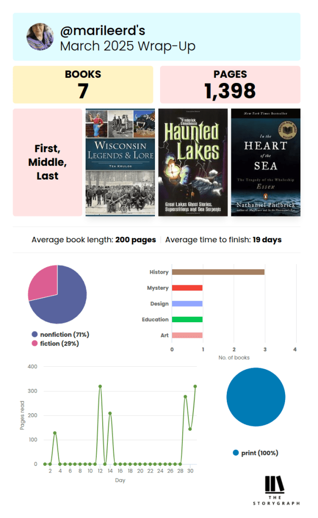I have set myself and admittedly modest goal of reading 25 books this year and am making good progress on that. March especially was a good month. I read the 3rd and most recent book of Annelise Ryan’s Wisconsin-based cyptid hunter series, which I very much enjoyed. The nonfiction books were all interesting as well.