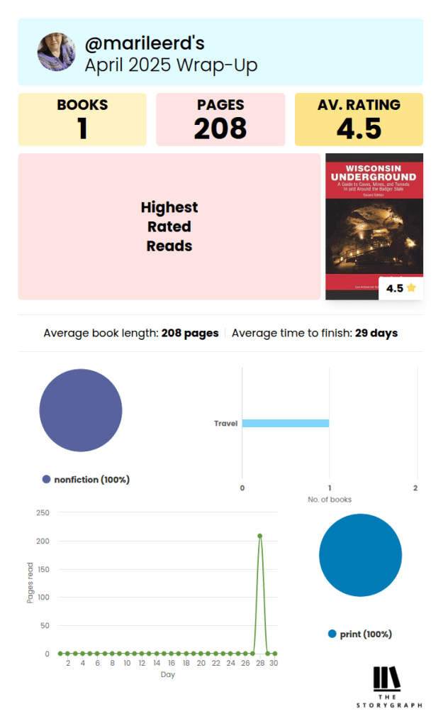 Even though it was just the one book, it was an interesting one. DH and I love going to caves and Wisconsin Underground is an exhaustive listing of all the caves and cave-like places in and around Wisconsin.